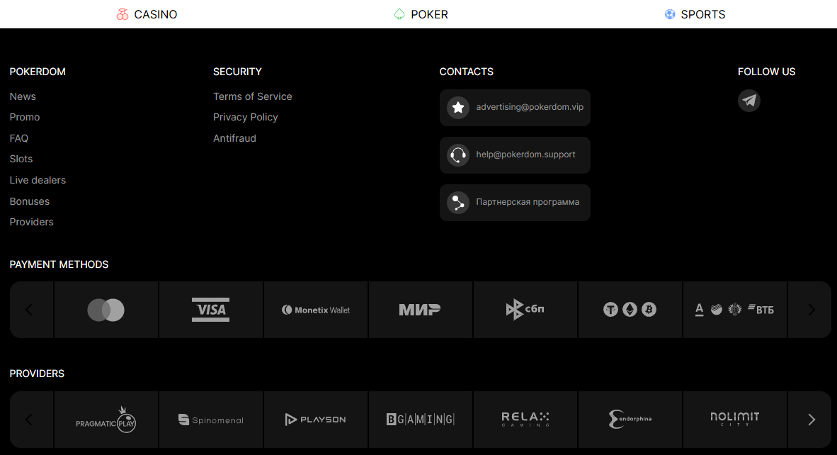 The short version: Pokerdom offers separate loyalty systems for casino and poker. For poker players — some of the best conditions in the CIS market.